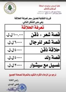 صدر عن نقابة اصحاب صالونات الحلاقة في لبنان تسعيرة جديدة لتعرفة الحلاقة جاءت على الشكل التالي: