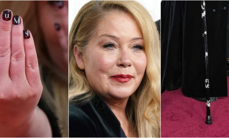 في مظهر اتشح بالسواد، مؤلّف من فستان مخمل أنيق من توقيع Christian Siriano، قدّمت ممثلة Dead to Me، التي تعاني من التصلّب اللّويحي منذ عام 2021، نفسها بشكل خاص مع عصا مختومة بعبارة “اللعنة على مرض التصلب اللويحي”. ولم تترك النجمة عصاها وحدها تتكلّم بل عرضت ممثلة “Anchorman” مانيكير بالأبيض والأسود كتب عليه “FU MS” (اللعنة على مرض التصلب اللويحي) على أظافرها.