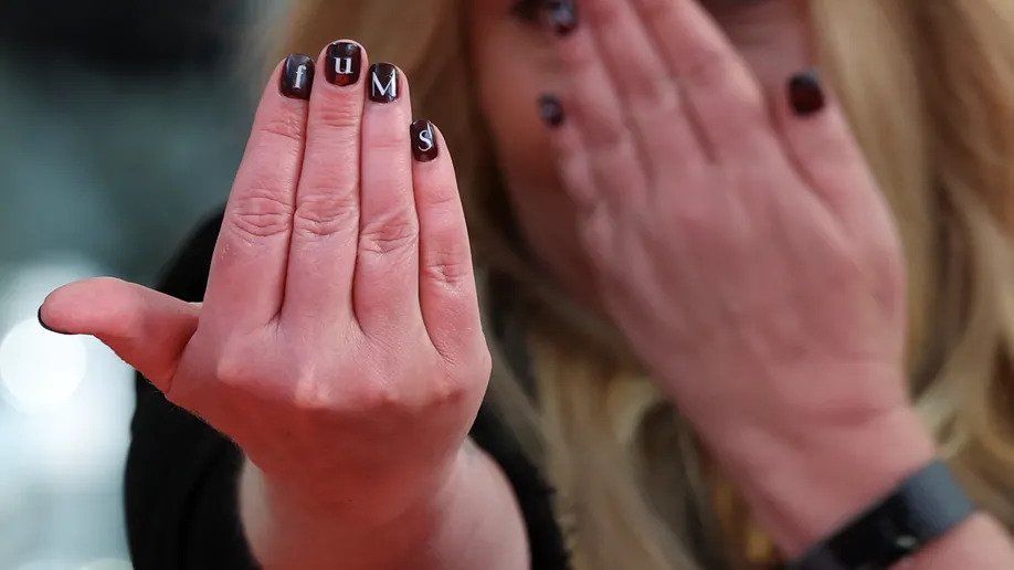 لقطة مقرّبة لعصا كريستينا آبلغيت مع رسالة “FU MS”