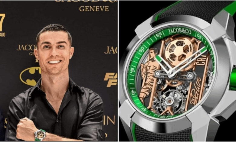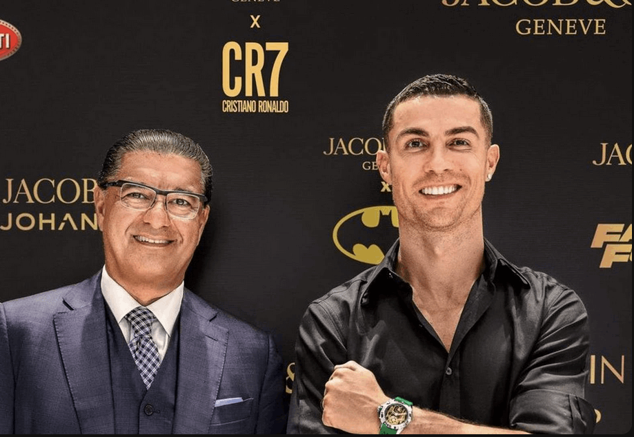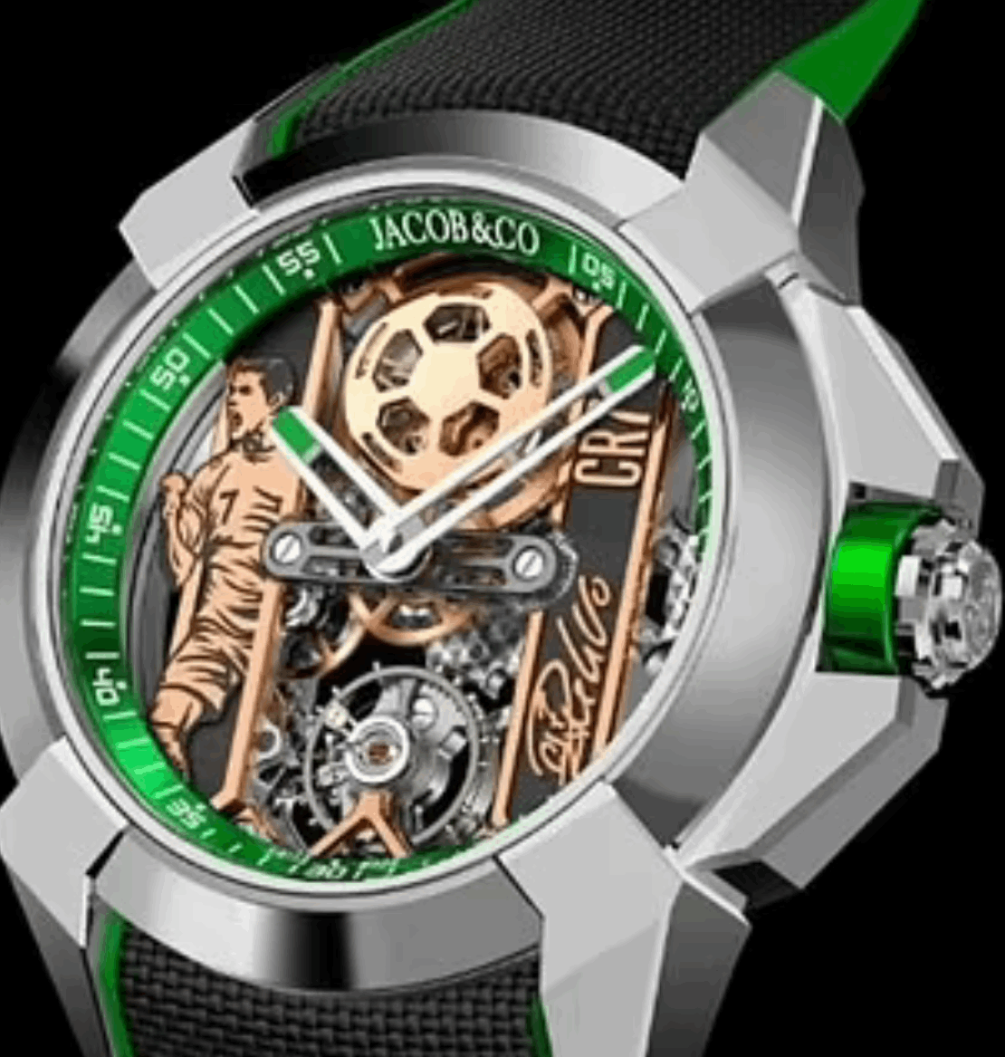 استحوذ اللاعب كريستيانو رونالدو على ساعة فاخرة بقيمة 92 ألف جنيه إسترليني أي ما يقارب الـ115 ألف دولار من Jacob and Co بتصميم أخضر متوهج يضم 26 ماسة بيضاء، وذلك عند إطلاق مجموعة الشركة الجديدة.
